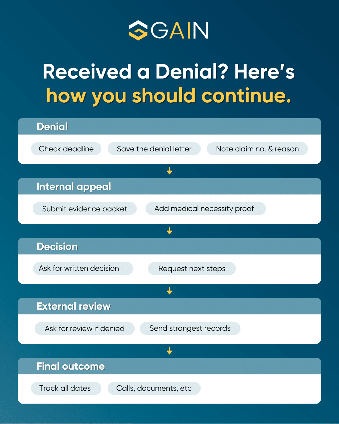 Well, the good news is a denial is often not the end of the road. In many situations, you have the right to challenge the decision through an internal appeal (with your insurer) and, if needed, an external review (by an independent reviewer).