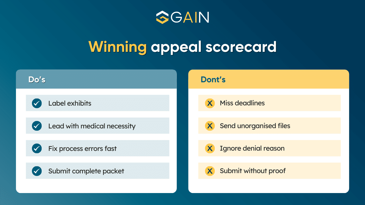 Create a one-page cover summary, then back it up with clearly labeled exhibits. Reviewers are more likely to overturn a denial when the support is obvious and easy to verify.