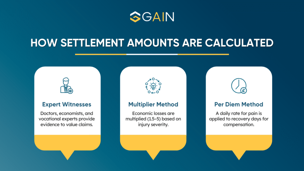 Settlement values are calculated based on economic damages (like bills and lost wages), non-economic damages (like emotional distress), and sometimes punitive damages. Attorneys may use the multiplier or per diem method to value pain and suffering.