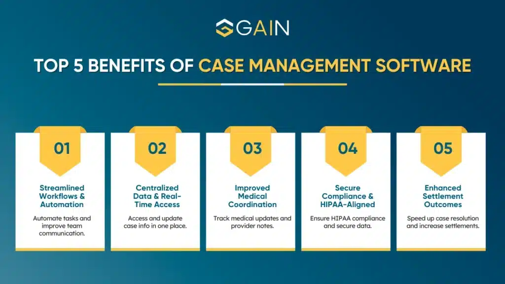 • The top 5 Benefits of Case Management Software include automation, centralized data access, improved medical coordination, higher compliance, and better settlement outcomes.