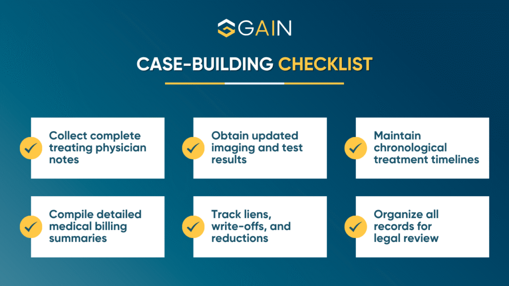 Attorneys using a checklist early set themselves up for smoother negotiations, stronger claims, and fewer disputes with providers.