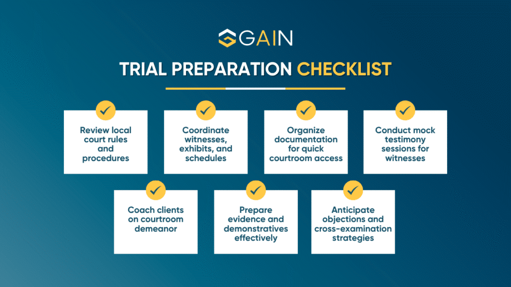 • Ensure all documentation is organized for quick access during trial.