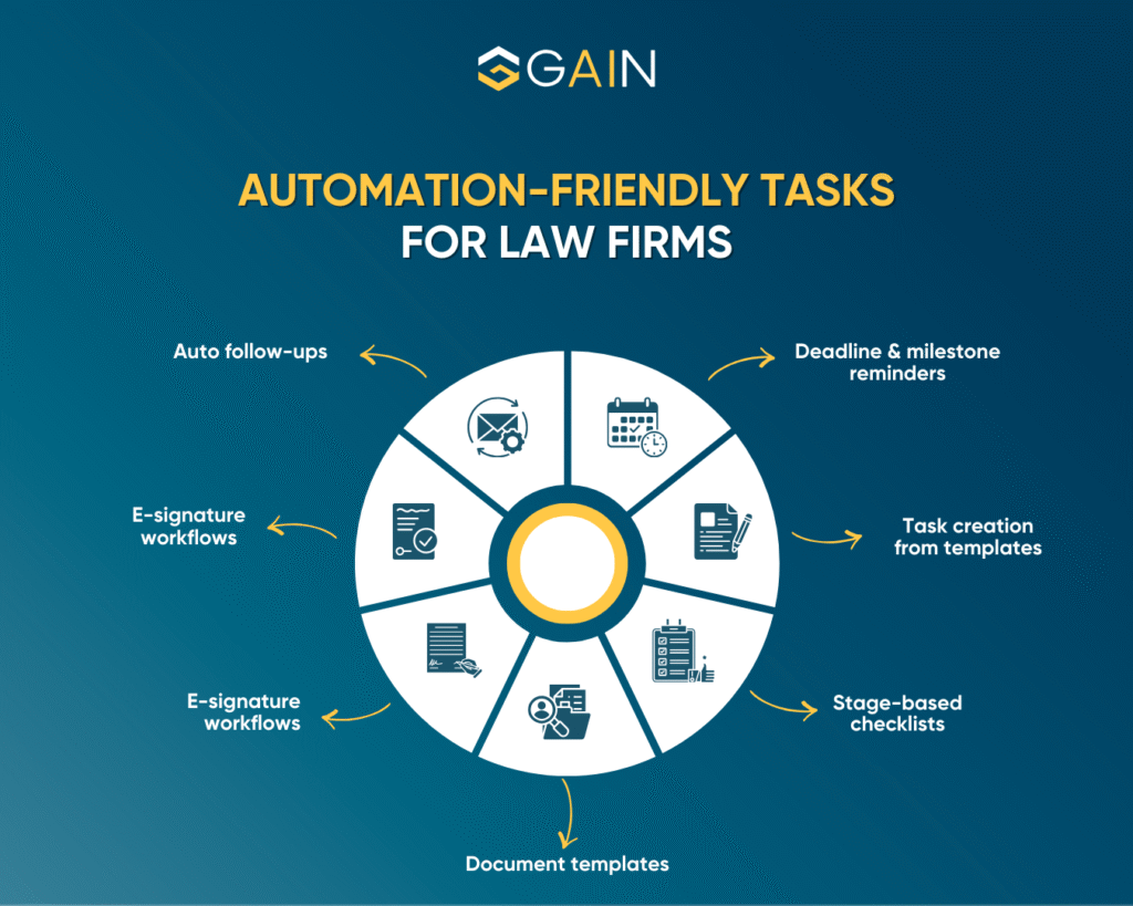 Automation is about removing repetitive steps that quietly steal hours. These include follow-ups, reminders, routing documents, creating tasks, and generating routine forms. Done well, automation is one of the most direct ways to improve law firm efficiency.